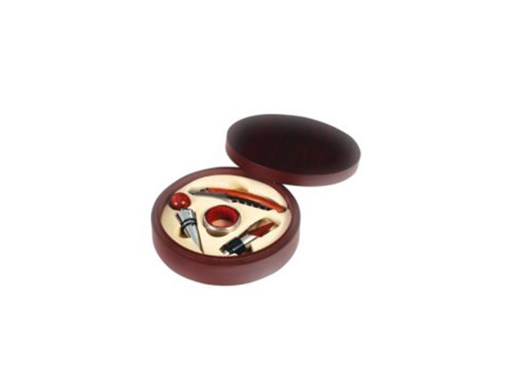 Dřevěná dárková krabička kulatá je skvělým dárkem pro milovníky vína. Tento elegantní balíček obsahuje vše potřebné pro servírování vína.